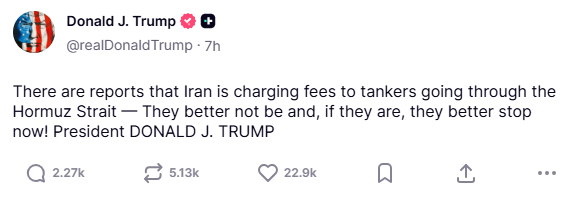 ট্রাম্প গতকাল (বৃহস্পতিবার, ৯ এপ্রিল) পোস্টে লেখেন, ‘হরমুজ প্রণালি দিয়ে যাওয়া ট্যাংকারের কাছ থেকে ইরান ফি নিচ্ছে—এমন খবর পাওয়া যাচ্ছে।’