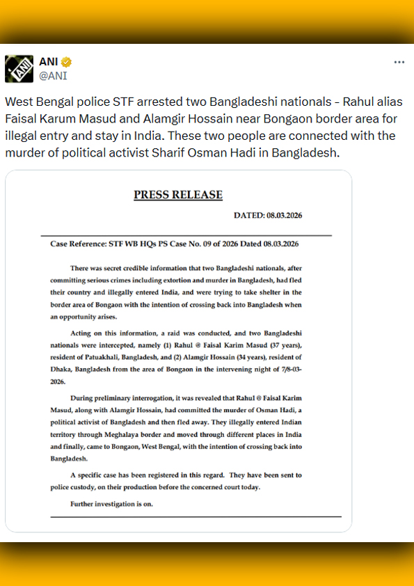 জুলাই আন্দোলনের মুখ এবং ‘ইনকিলাব মঞ্চের’ মুখপাত্র শরিফ ওসমান হাদি হত্যাকাণ্ডে অভিযুক্ত প্রধান দুই আসামিকে ভারতের পশ্চিমবঙ্গ থেকে গ্রেপ্তার করেছে রাজ্য পুলিশের স্পেশাল টাস্ক ফোর্স (এসটিএফ)। আজ (রোববার, ৮ মার্চ) ভোরে ভারত-বাংলাদেশ সীমান্তবর্তী উত্তর ২৪ পরগনার বনগাঁ এলাকা থেকে তাদের গ্রেপ্তার করা হয়। বার্তা সংস্থা এএনআই’র প্রতিবেদনে এ তথ্য জানানো হয়েছে।
