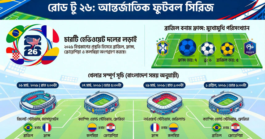 তারিখ (বাংলাদেশ সময়) ম্যাচ (Match) সময় (Time) ভেন্যু ও শহর (Venue & City) ২৬ মার্চ ২০২৬ ব্রাজিল বনাম ফ্রান্স রাত ২:০০ টা জিলেট স্টেডিয়াম, ফক্সবরো (MA) ২৭ মার্চ ২০২৬ ক্রোয়েশিয়া বনাম কলম্বিয়া ভোর ৫:৩০ টা ক্যাম্পিং ওয়ার্ল্ড স্টেডিয়াম, অরল্যান্ডো (FL) ২৯ মার্চ ২০২৬ কলম্বিয়া বনাম ফ্রান্স রাত ১:০০ টা নর্থওয়েস্ট স্টেডিয়াম, ল্যান্ডোভার (MD) ১ এপ্রিল ২০২৬ ব্রাজিল বনাম ক্রোয়েশিয়া ভোর ৬:০০ টা ক্যাম্পিং ওয়ার্ল্ড স্টেডিয়াম, অরল্যান্ডো (FL)